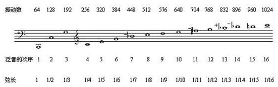 在对基准音组分律时,大三度是利用吻合谐音的冠四根五来实现的,大六度是利用吻合谐音的冠三根五来实现的。所产生误差的原理和四度、五度一样。