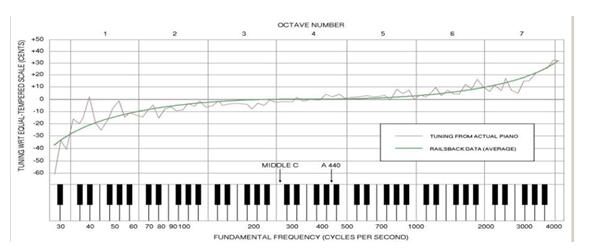 内行的调律师一定对音准曲线非常熟悉。在八度扩展中,冠音的音高是由根音的第一泛音来确定的,理想弦的各次泛音的频率应与基频为整倍数,由于受钢琴弦劲度、均匀度等因素的影响,泛音会略高于基频的整倍数,从而造成了高音逐渐偏高,低音逐渐偏低,同时产生了音准曲线。对于不同的钢琴品牌,上述情况都会因钢琴弦的非理想性程度不同而产生的音准曲线也不尽相同。